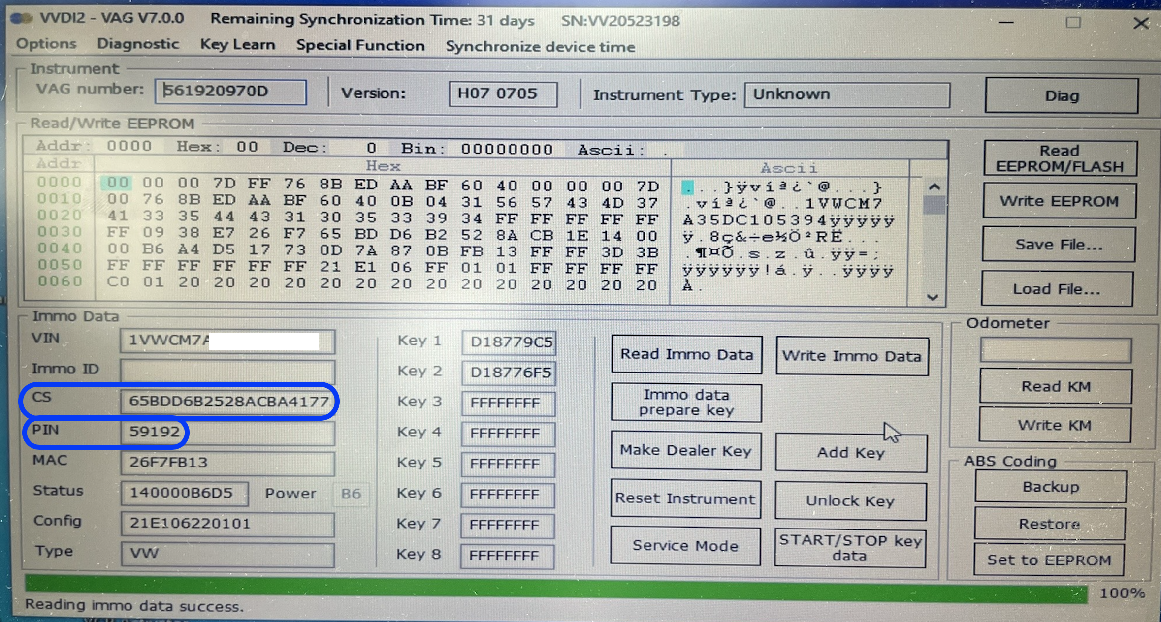 Also, you’ll need the immo data (VIN, Power, CS, PIN) of the car that KESSY is being retrofitted to. That’s the immo data that must be written to the ELV. For this, simply connect VVDI2, VAGtacho or similar (VCDS will not work) and read the immo data. Save it for later.