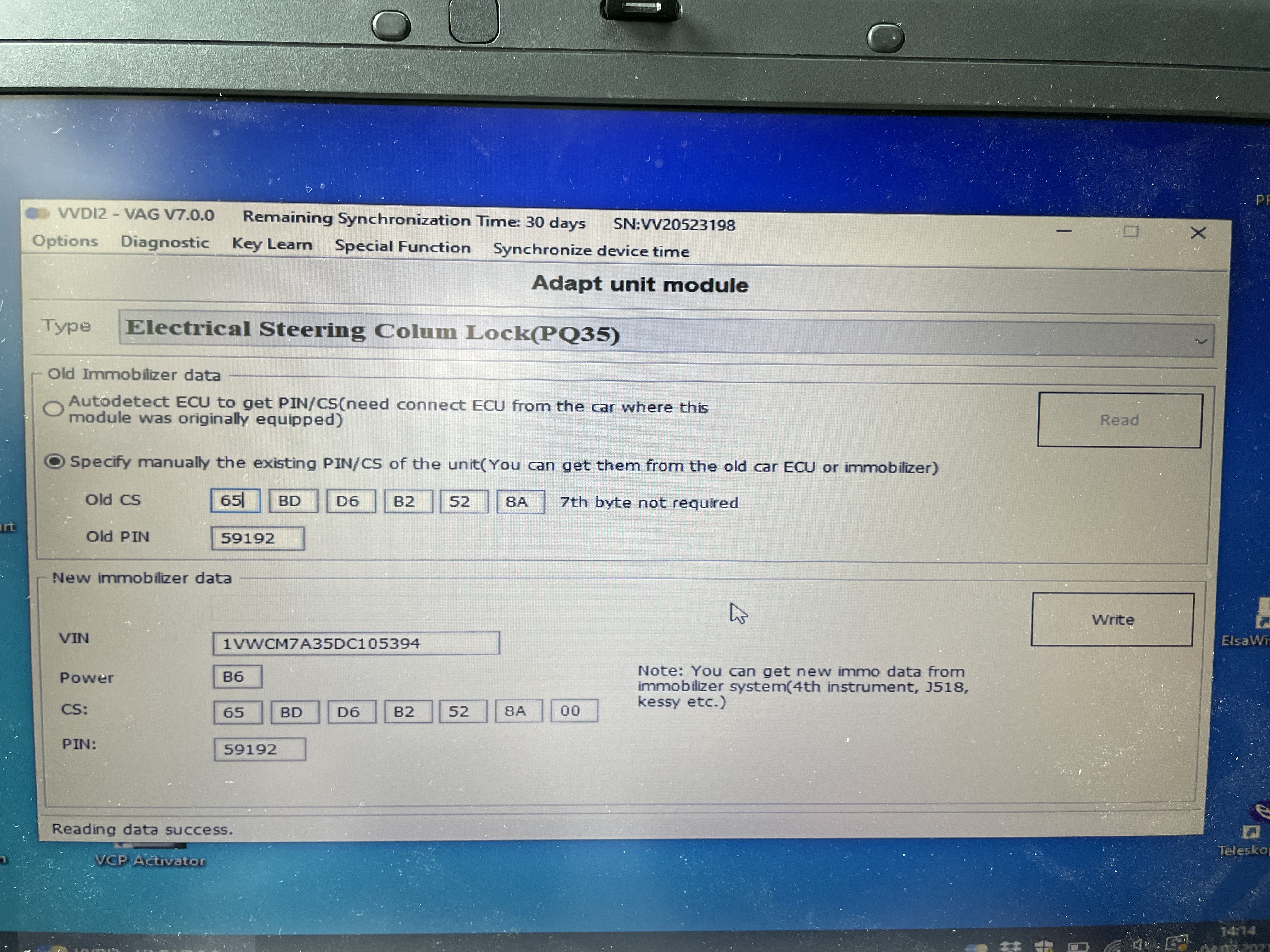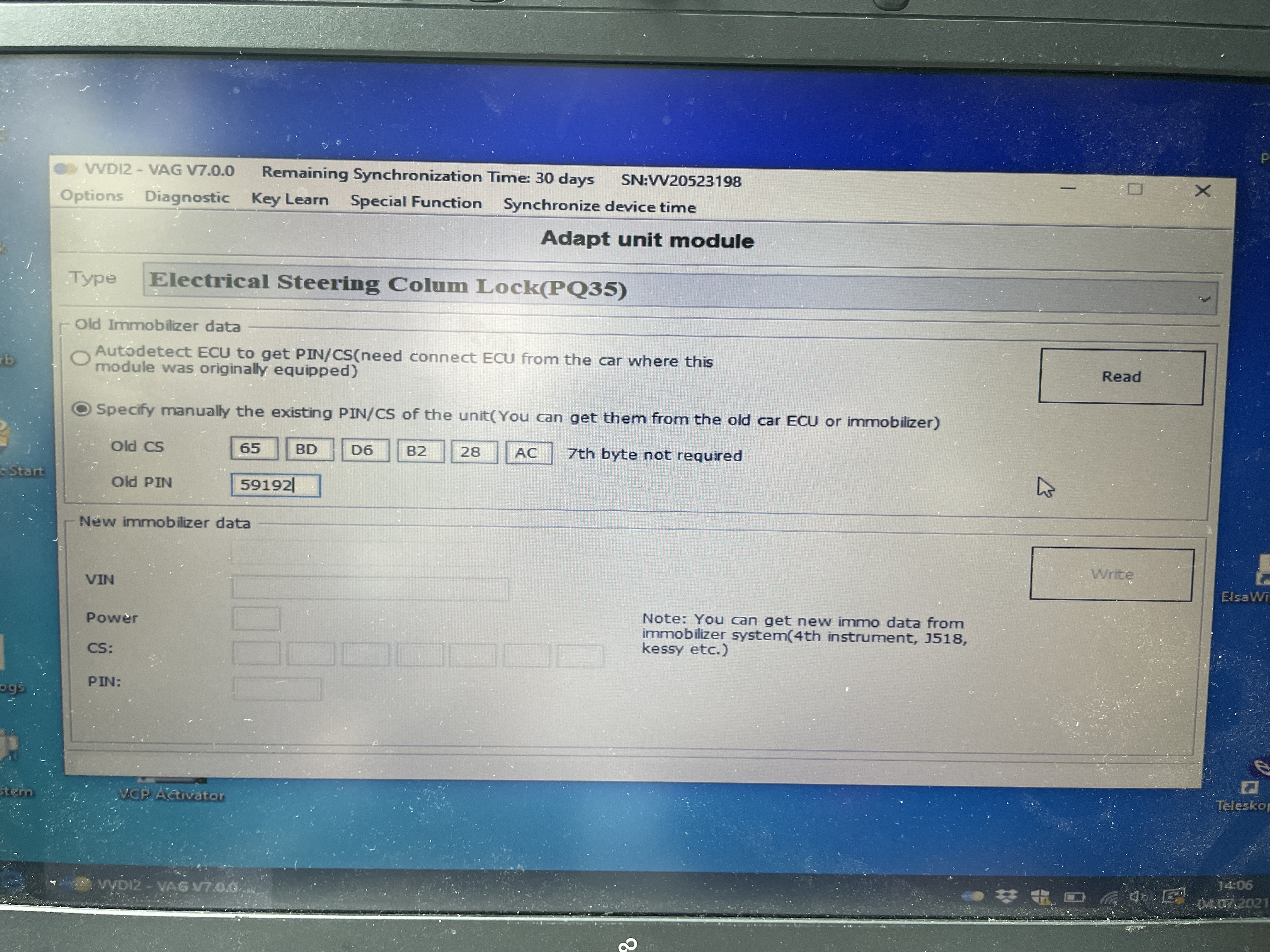 Step 1: Install the ELV in the car, with VVDI2 go to „Adaption“ -> „Electrical Steering Column Lock (PQ35)“ function and enter the donor immo PIN and CS. Press „Read“ to get access.