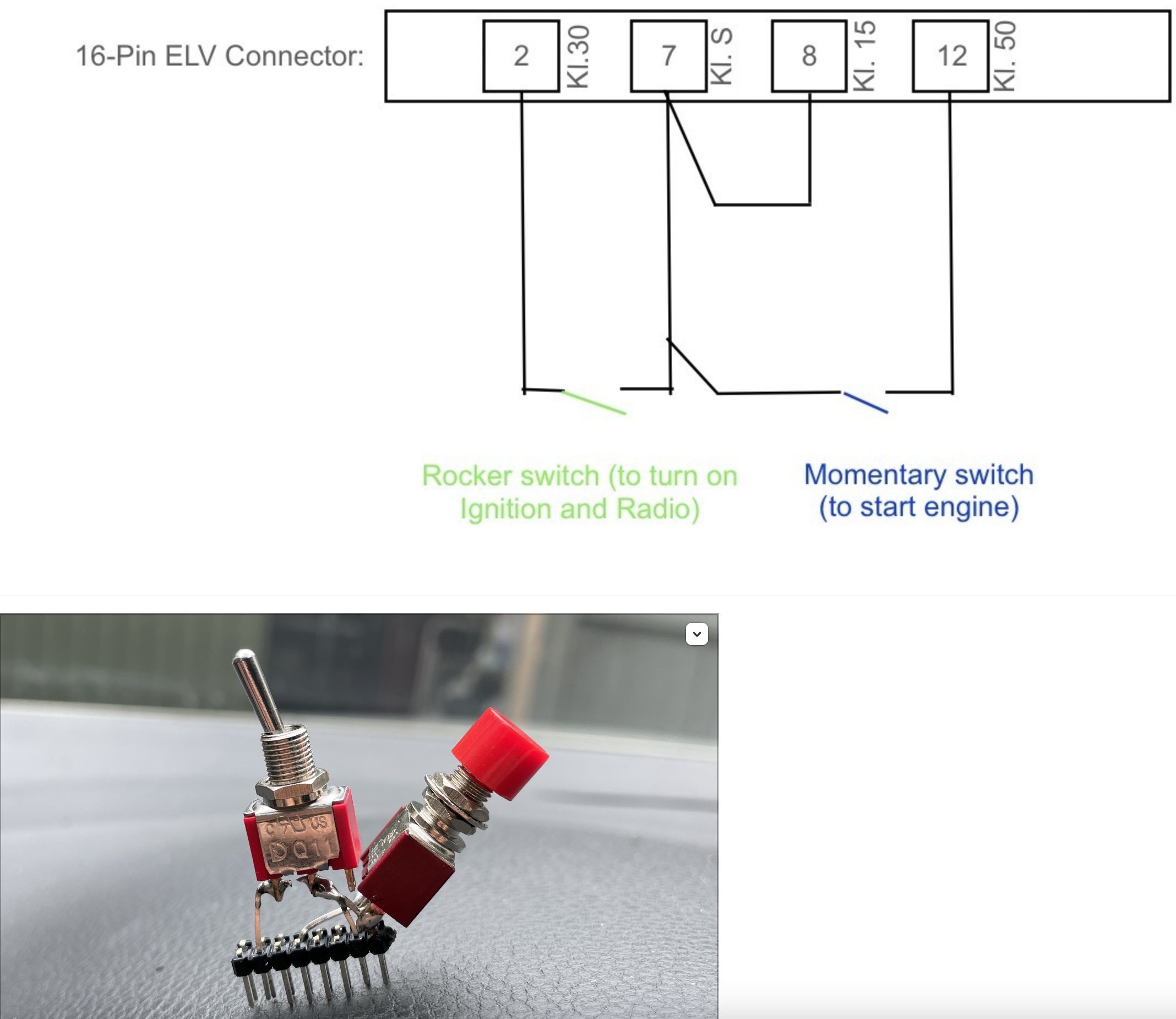 It’s possible to get KESSY running without using the ELV at all. This might come in handy when retrofitting, because you might wish to install everything else first. Remeber, a sucessfully learned KESSY key is required. If you wish to install the ELV later, you need to „simulate“ it’s functions: Generating Kl. 15, Kl. S and Kl. 50. This can be done by installing one rocker switch and one momentary switch instead of the ELV: